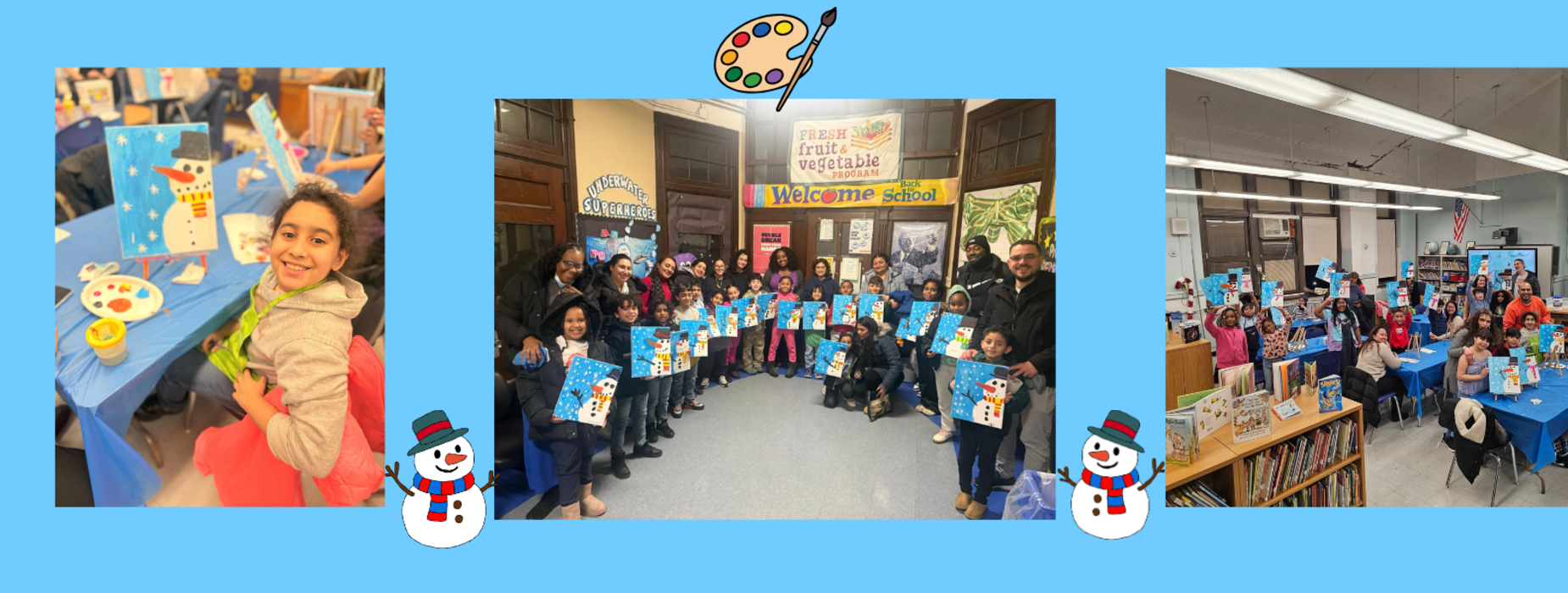 Students and parents painted snowman canvases together to take home and display—and had a blast doing it!