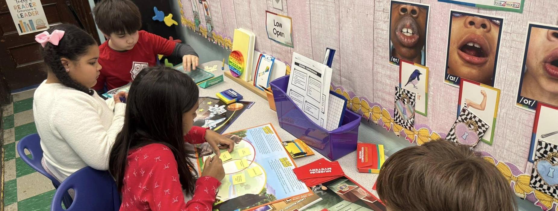 In small group with Mrs. Caracozza, our third and fourth graders are strengthening their reading comprehension skills by working together and engaging with our reading comprehension folder games using both fiction and informational texts 📚